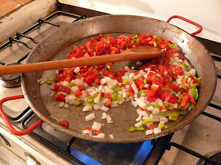 Prep the vegetables by cutting into small pieces, dice the garlic and fry together in the paella pan using a splash of olive oil. Cook until the onions become translucent.